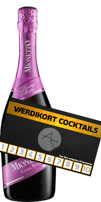 Pakken består af 10 valgfrie cockatils til max værdi 90 kr pr stk. Værdikortet vil ligge på jeres bord sammen med en Mionetto 70cl rosé champagne når i ankommer.