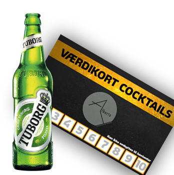 Pakken består af 20 valgfrie cockatils til max værdi 90 kr pr stk. Værdikortet (1x10 cocktails) vil ligge på jeres bord sammen med 5 stk tuborg profil når i ankommer.