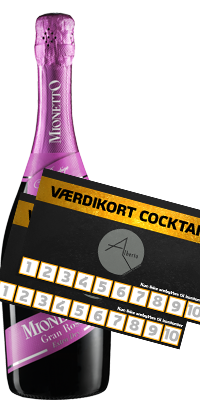 Pakken består af 20 valgfrie cockatils til max værdi 90 kr pr stk. Værdikortene (2x10 cocktails) vil ligge på jeres bord sammen med en Mionetto 70cl rosé champagne når i ankommer.